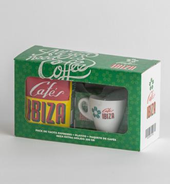 Set van een espressokopje met schoteltje en Ibiza Extra gemalen koffie van 250 g.